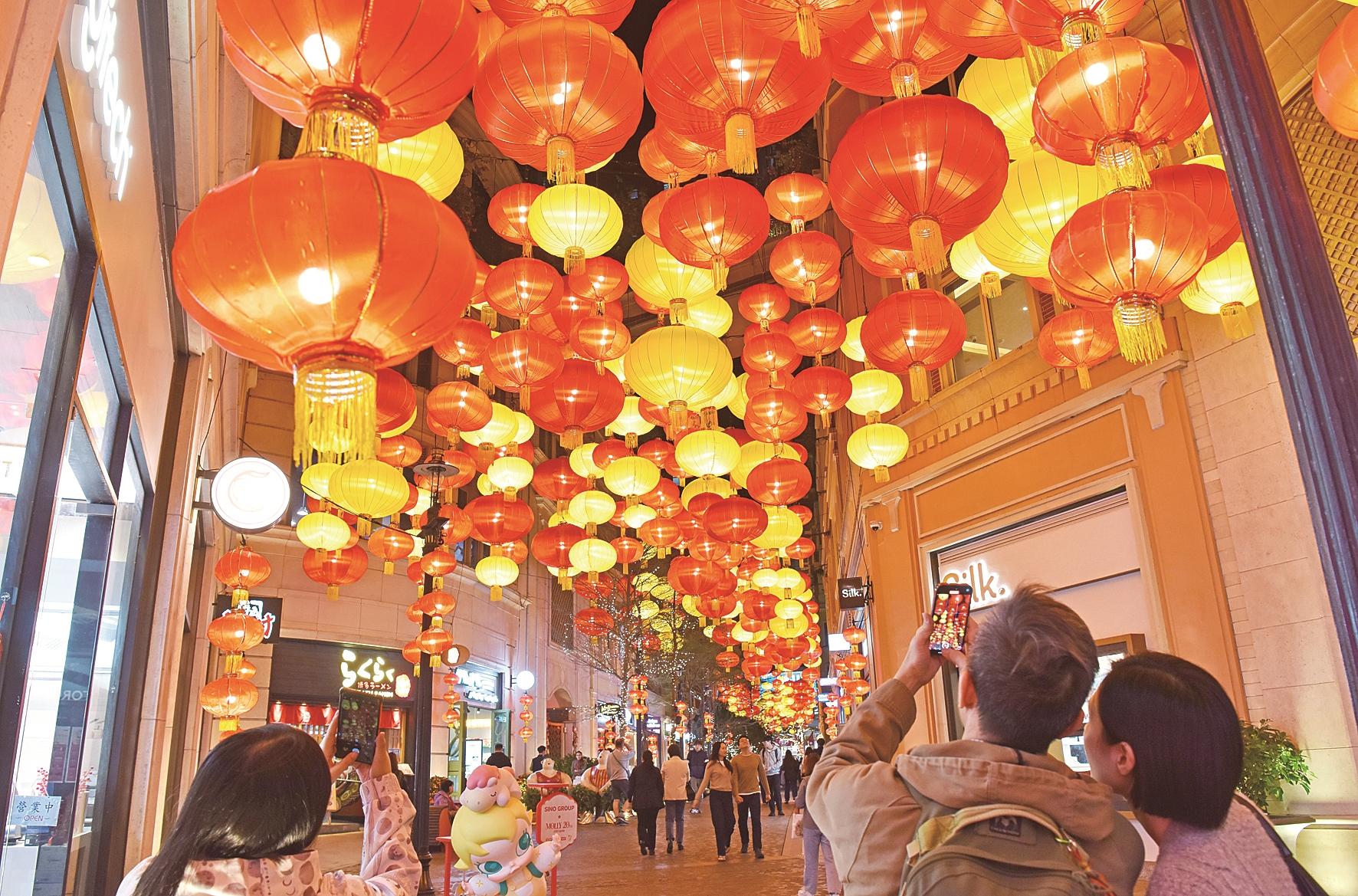 春节临近,香港利东街挂满大红灯笼,一派喜庆气氛。