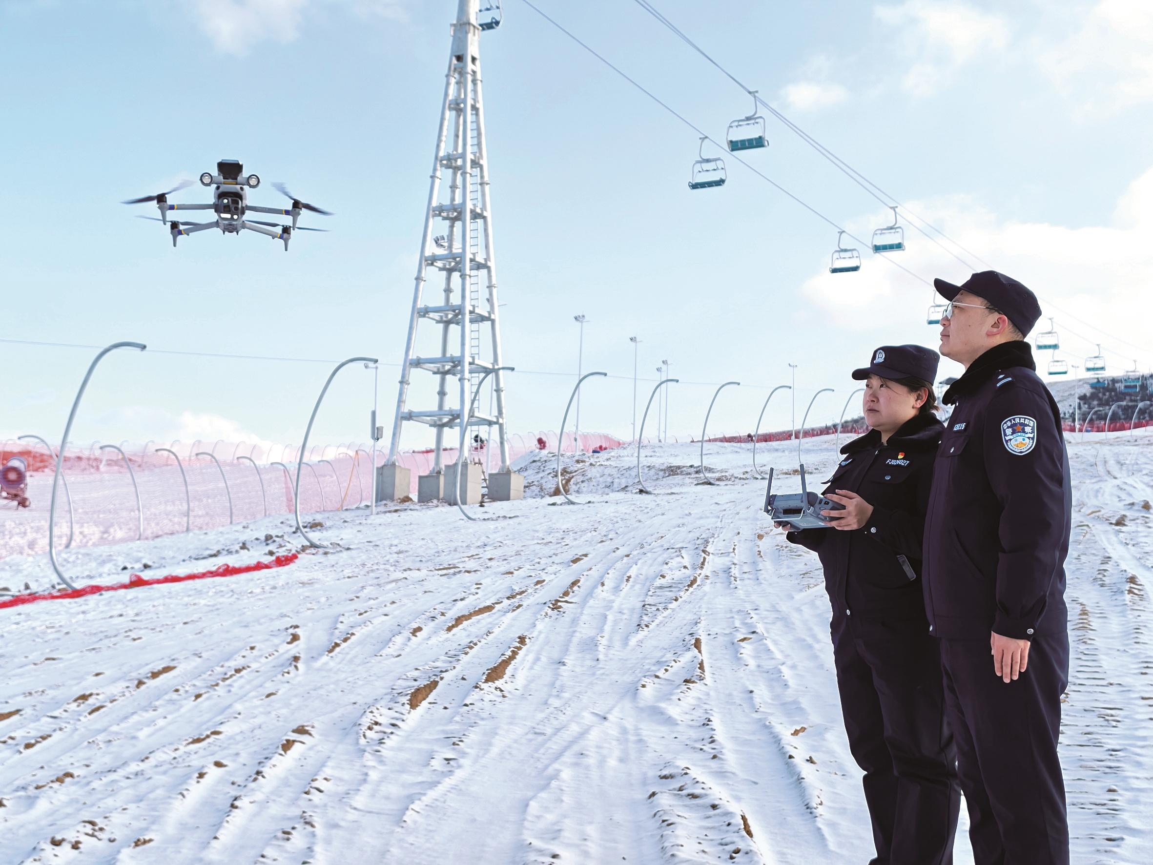 为保障雪场安全开业,包头市公安局石拐分局启用“数智卫士”警务实战体系,构建“空天地网+”立体防控网络,应对滑雪场地形复杂、客流预判难等挑战。利用搭载AI智能识别的无人机开展全域排查,重点监测雪道边坡、设备周边隐患,并结合深山搜救经验,制定雪场人员走失后热成像搜救预案,提升应急能力。