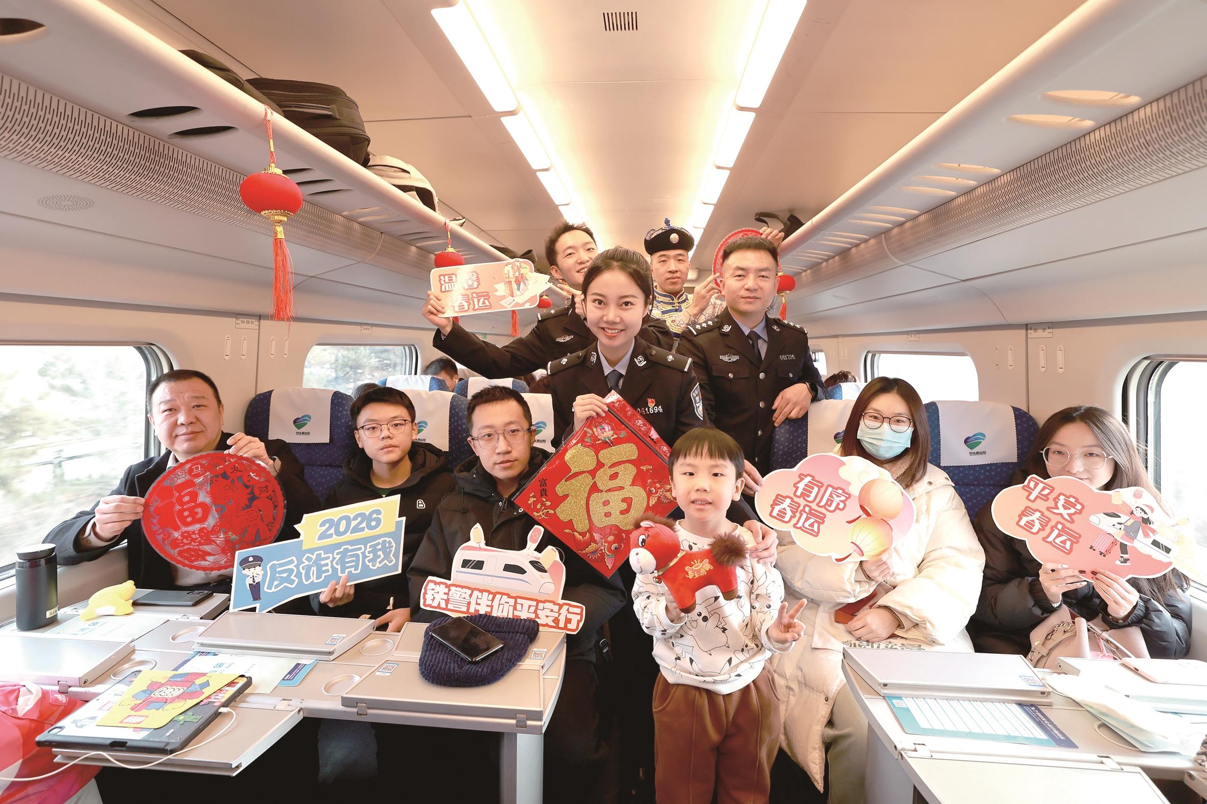 近日,在D6762次“春运主题列车”上,红彤彤的福字、灯笼将车厢装点得暖意融融。民警合唱的《上春山》旋律轻快,瞬间点燃现场氛围;马头琴独奏《美丽草原我的家》,赢得旅客阵阵掌声。文艺表演间隙,防盗防骗演示环节干货满满。民警现场示范背包前置、贵重物品贴身存放等实用技巧,邀请旅客亲身参与体验,直观讲解出行安全注意事项。有奖知识问答环节,主持人围绕行李存放、陌生转账警惕性、易燃易爆物品禁带规定等春运安全知识点抛出一个个问题,旅客们踊跃抢答,获得奖品,在轻松互动中加深了对安全的认识。