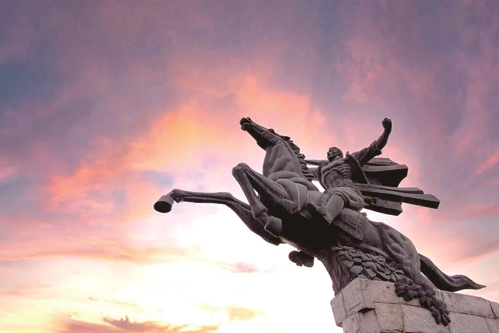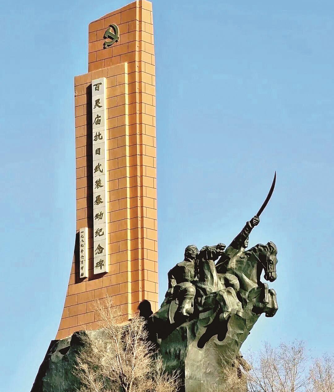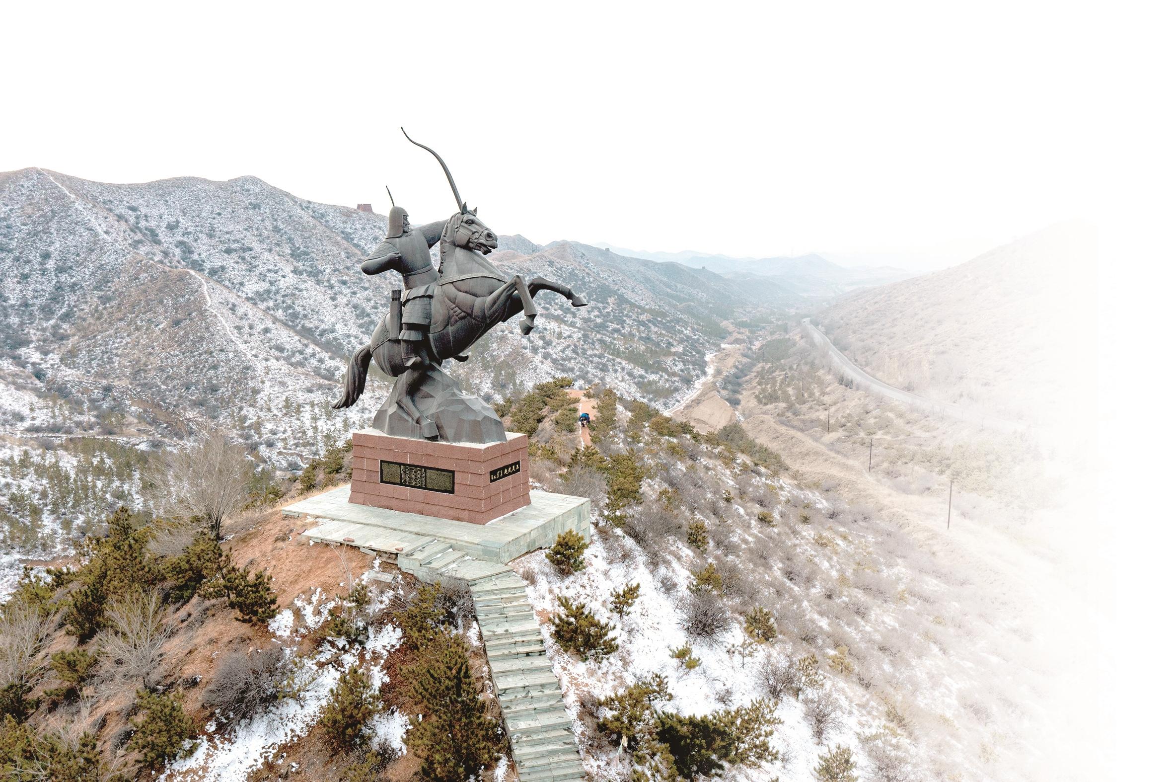 航拍镜头掠过石拐区,策马弯弓的赵武灵王雕塑矗立在赵长城遗址旁,与逶迤的古长城遗迹相伴,定格下胡服骑射、锐意改革的历史瞬间。转向达茂旗女儿山,百灵庙抗日武装暴动纪念碑前,战马腾空,战士威武,航拍视角下更显庄严肃穆,这尊雕塑承载着永不磨灭的红色记忆。