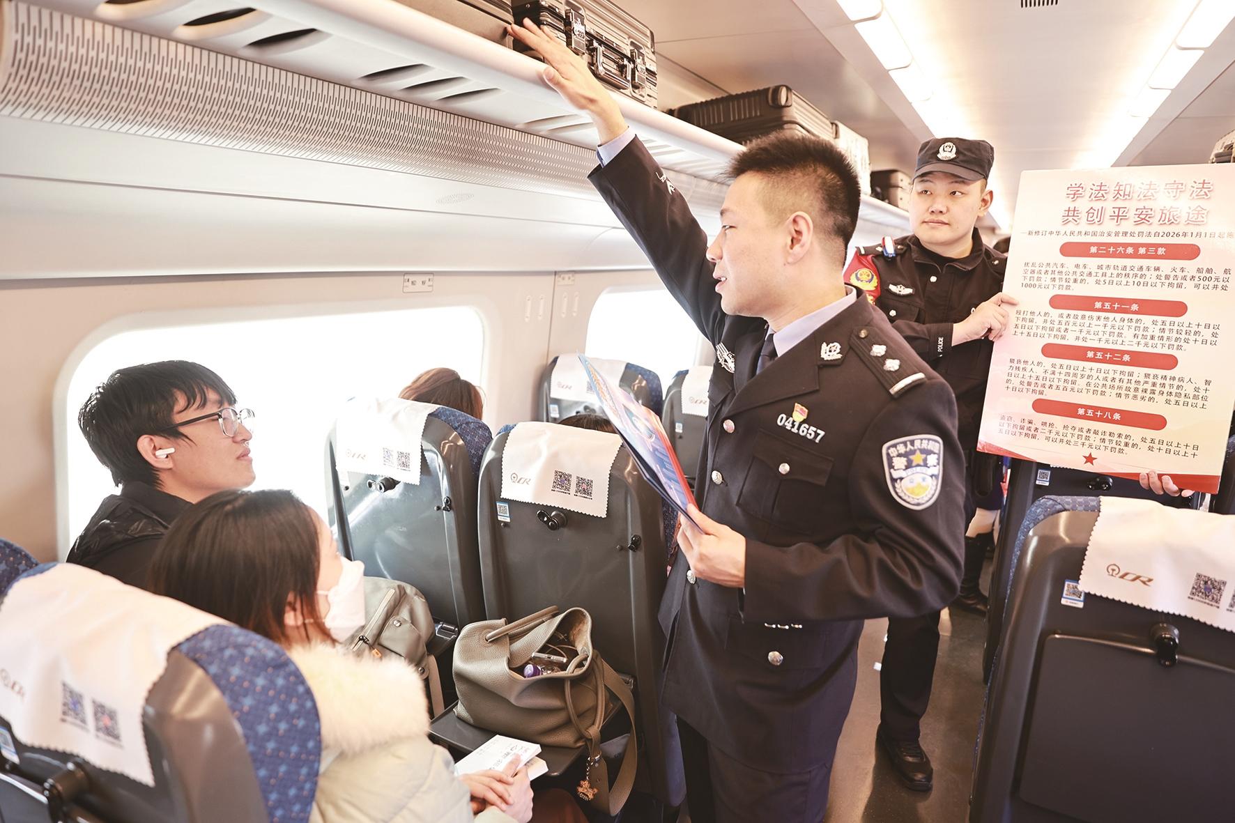 而守护这份期盼的,是一群年轻的藏蓝身影。列车启动不久,乘警庄文骞亲切而响亮的声音便在车厢中响起:“各位旅客,高铁全程禁烟,这一口烟的‘成本’可能很高哦。”诙谐的提醒顿时引来阵阵笑声。他和同事们深知,沿线有许多第一次乘坐高铁的旅客,于是将安全知识编成顺口溜,把反诈案例讲成小故事,让生硬的规定化为温暖的叮嘱。这种春风化雨的方式,成了乘警与旅客之间最初的信赖桥梁。