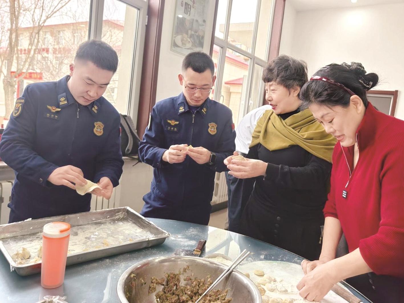 活动在爱永在合唱团带来的大合唱《爱永在》中拉开序幕,悠扬旋律传递着对消防员的敬意。现场张灯结彩,猜灯谜、滚元宵、包饺子等民俗活动轮番上阵,大家围坐一起揉面、擀皮、包馅,居民手把手教消防员包“元宝”饺子,欢声笑语不断。热腾腾的饺子与香甜的汤圆上桌,众人共品美食、共话家常,节日氛围浓厚。