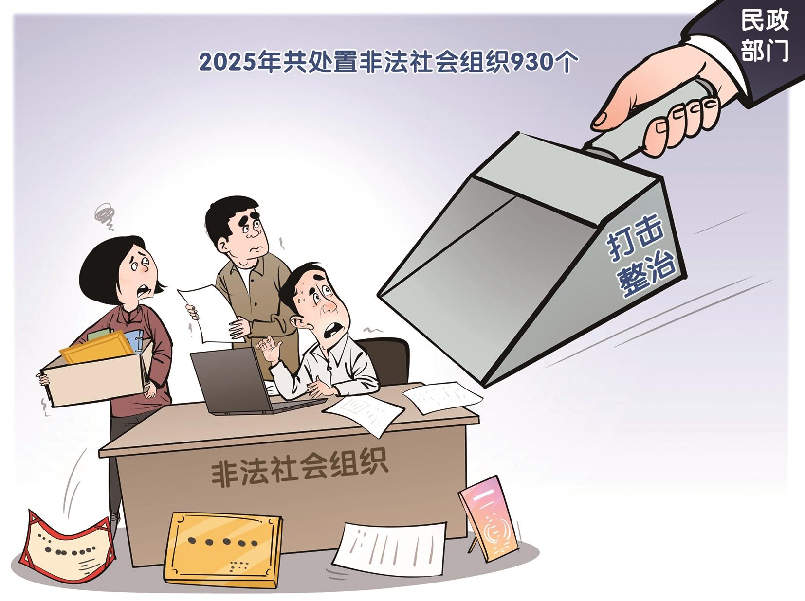 记者2月28日从民政部获悉,2025年,各地民政部门深入推进打击整治非法社会组织,全年共处置非法社会组织930个,其中取缔203个、劝散339个、自行解散321个、引导登记67个。