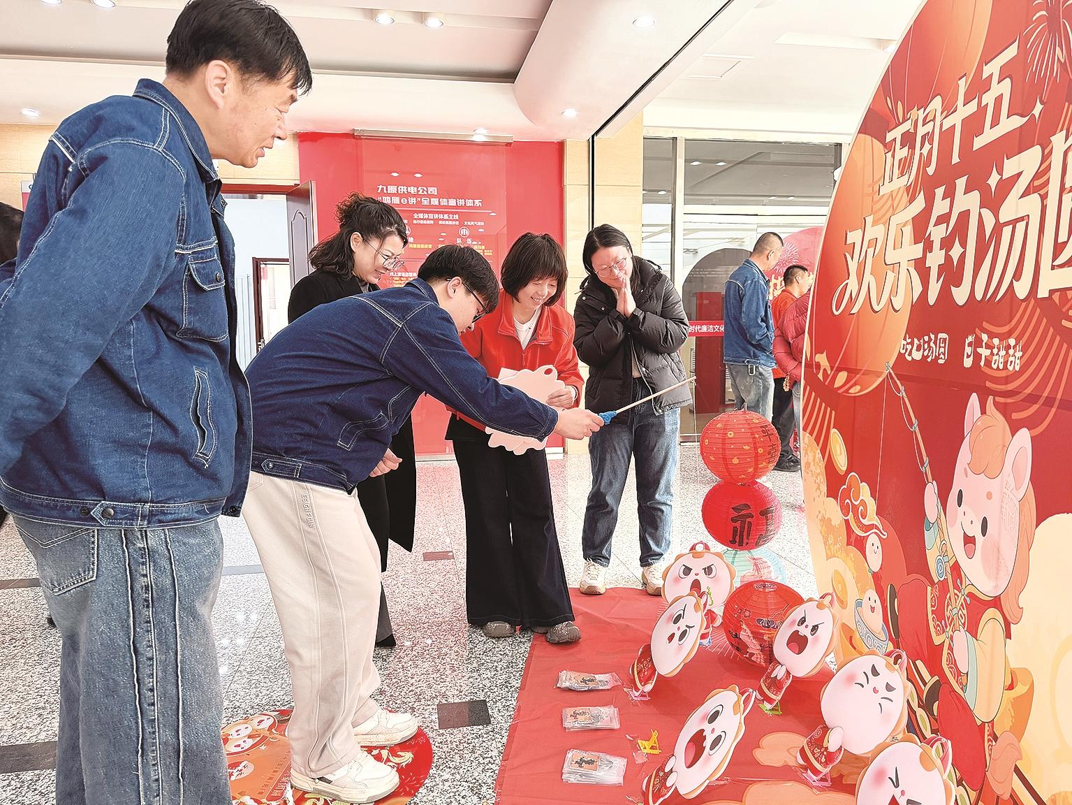 本报讯 3月3日,内蒙古电力集团包头九原供电公司开展“锦韵上元·同心吉游”2026年马年元宵非物质文化遗产主题活动。活动紧扣马年主题,串联猜灯谜、投壶纳福、元宵赶马乐、欢乐钓汤圆、匠心传艺等多个环节,现场洋溢着喜庆祥和的节日氛围,让职工在“一步一景”中感受非遗魅力,传承中华优秀传统文化,丰富精神文化生活。