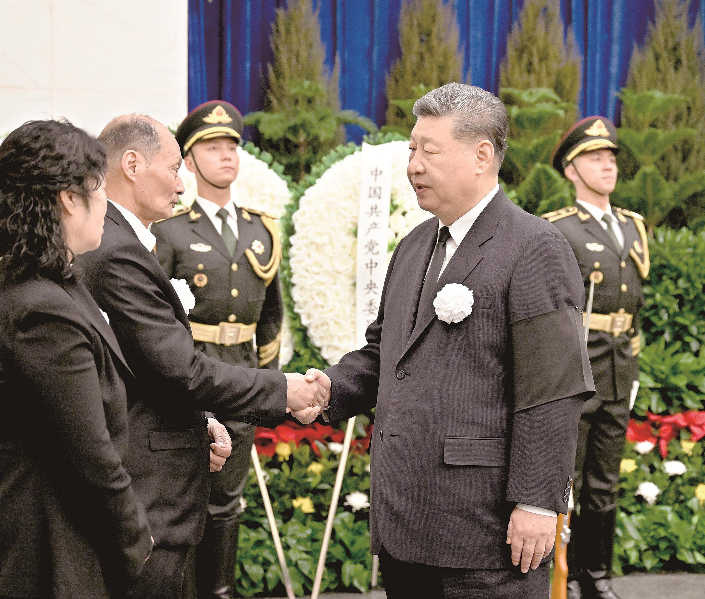 3月10日,宋平同志遗体在北京八宝山革命公墓火化。习近平、李强、赵乐际、王沪宁、蔡奇、丁薛祥、李希、韩正等前往八宝山送别,胡锦涛送花圈表示哀悼。这是习近平与宋平亲属握手,表示深切慰问。新华社记者 谢环驰 摄