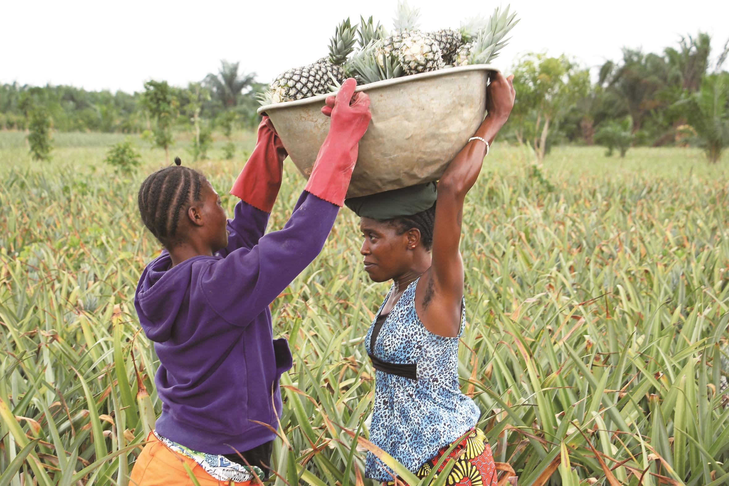3月16日,农民在贝宁“甜面包”菠萝主产区泽镇的一片菠萝田里劳作。