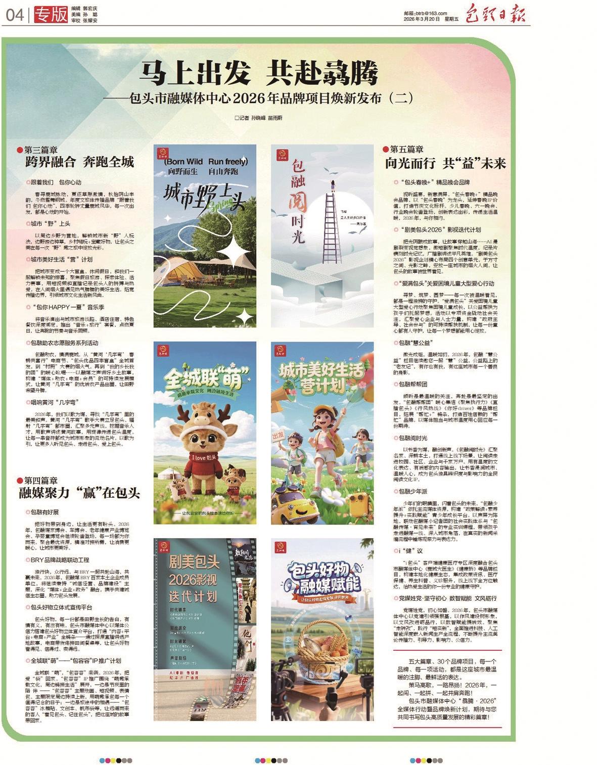 “骉腾·2026”全媒体行动暨品牌焕新计划紧扣城市发展战略,包头市融媒体中心系统性推出五大篇章、三十个品牌项目,旨在构建“新闻+政务+服务+商务”深度融合的现代传播与服务体系。以“奔跑不息 新新向融”篇章,全景记录“1144”现代化产业体系发展与民生温度;以“智媒赋能 融创未来”篇章,驱动“i包头”客户端与AI技术深度融合,打造智慧生活新入口;以“跨界融合 奔跑全城”篇章,激活文旅体商农资源,创塑城市活力IP;以“融媒聚力 ‘赢’在包头”篇章,搭建政企媒诚信生态圈,助力营商环境优化与本土好物出圈;以“向光而行 共‘益’未来”篇章,践行媒体责任,共筑温暖城市文化生态。此次焕新计划,是包头市融媒体中心继2025年成功打造品牌项目集群后的又一次系统性升级。过去一年,包头市融媒体中心生产了8万多条新闻稿件、2万多个短视频,对外传播、精品创优位居自治区前列,以全媒之力生动展现了包头的发展活力。