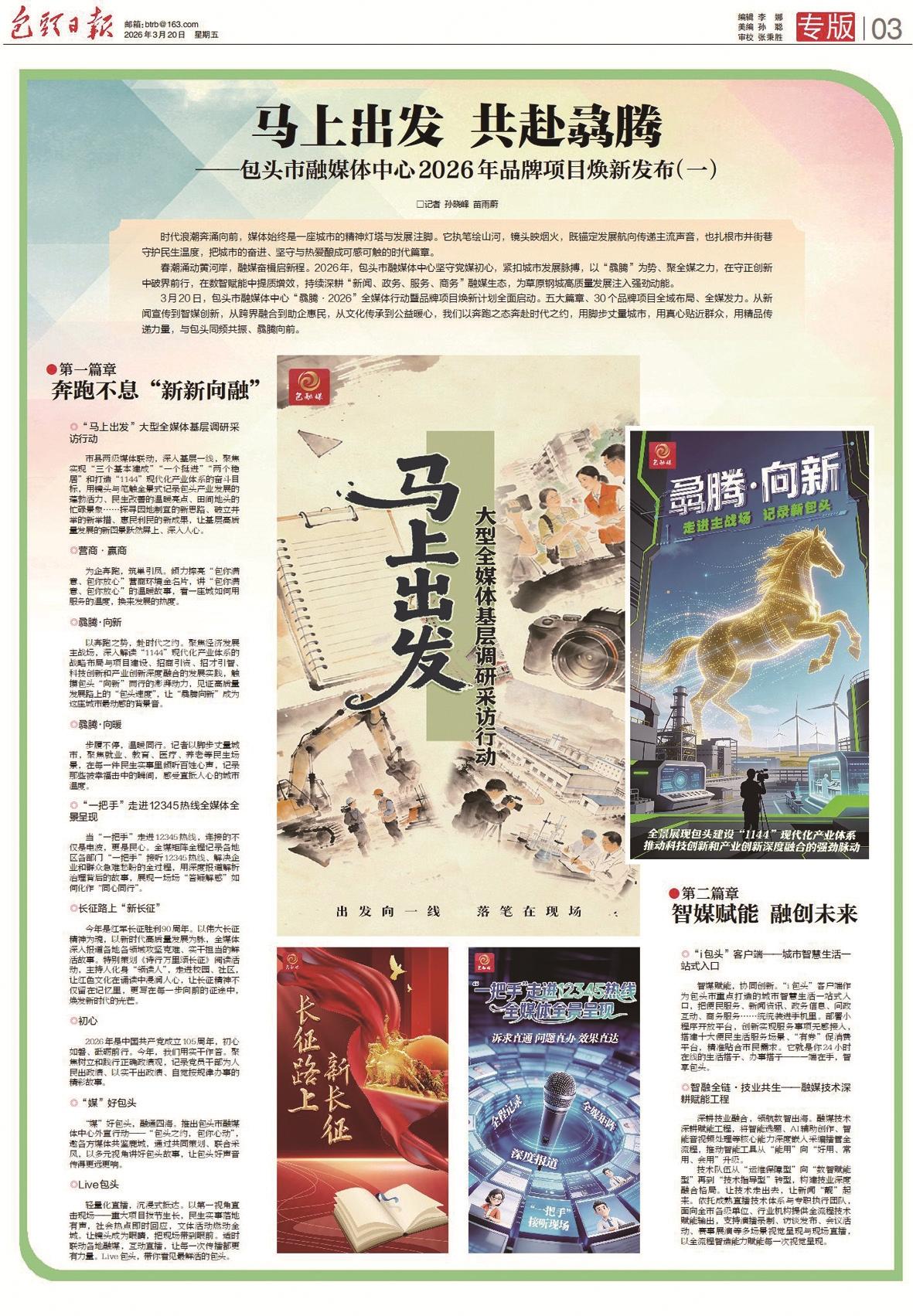 本报讯 春雷动地,万马骉腾。3月20日,农历二月初二,民间俗称“龙抬头”,包头市融媒体中心“骉腾·2026”全媒体行动暨品牌焕新计划全面启动,开启一场与城市战略同频、与时代脉搏共振的融媒新征程。