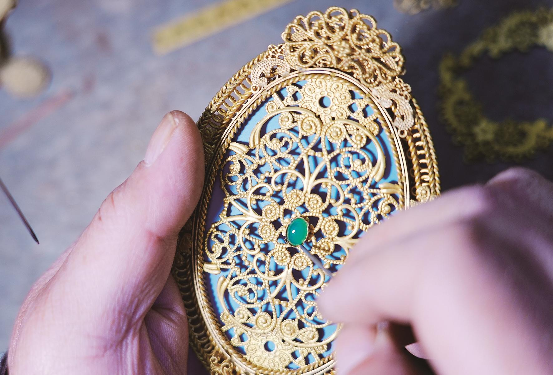 然而,传承之困始终让年过花甲的何军忧心。“如今全国能达到一定水准的匠人屈指可数。”他告诉记者,材料贵、周期长、难度大让许多年轻人望而却步,收徒、校企合作也屡屡受挫。怀着“绝不能让技艺在这代人手里断了”的使命感,何军正积极推动研发轻量化文创产品、举办校园体验活动,吸引更多年轻人近距离感受花丝镶嵌的魅力,努力为这项古老技艺培育新一代传承人。