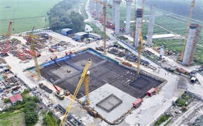 上午9点,南航道桥北锚碇施工区一片繁忙,两台巨型泵管如钢铁臂膀在烈日下“挥舞”,施工人员头戴安全帽、脚蹬橡胶鞋,在钢筋绑扎、凿毛处理、混凝土浇筑等岗位上专注忙碌,被汗水浸湿的衣衫在阳光下格外醒目。