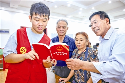 8月5日上午,江苏大学法学院的志愿者走进靖城街道团结路社区开展“青春走进社区 ‘典’亮美好生活”主题暑期社会实践活动。大学生们围绕邻里纠纷化解、相邻关系处理等居民关切的热点问题,结合《中华人民共和国民法典》讲解相关法律法规。图为2024级学生倪宸希向社区居民介绍法律知识。