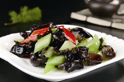 西芹200克,干黑木耳30克,大蒜3瓣,红椒半个,食用油适量,盐适量,鸡精少许,生抽1汤匙。