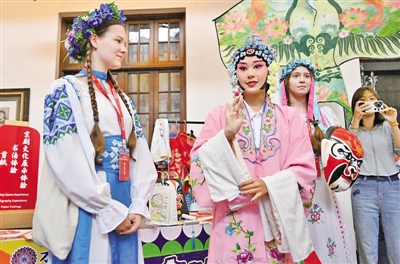 8月6日,“上合之约·丝路津彩”上合国家青年学生“万花筒”文化市集在天津庆王府举行。活动现场,来自中国、俄罗斯、乌兹别克斯坦等上合国家的数百位青年学生汇聚一堂,通过文化展示与体验、文艺演出等形式感受多元文化魅力。图为上合国家青年学生在体验京剧艺术。新华社发