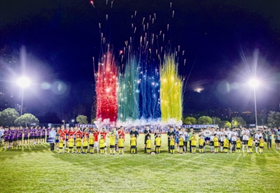 8月8日,2025靖江城市足球赛小组赛第二轮的3场比赛在三大赛场同步开赛,掀起新一轮全民足球热潮。图为开赛仪式现场。盛义摄