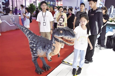 8月8日,以“让机器人更智慧,让具身体更智能”为主题的2025世界机器人大会在北京经济技术开发区开幕。大会由中国电子学会、世界机器人合作组织主办,全球200多家企业携1500余件展品参展。图为观众在2025世界机器人大会现场与展出的仿真恐龙互动。新华社发