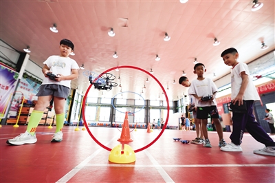暑假期间,各地孩子参加丰富多彩的文化体育活动,充实假期生活。图为8月10日,河北省晋州市青少年活动中心,小朋友操控小型无人机进行闯关游戏。 新华社发