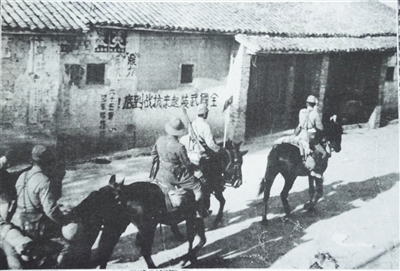 图为侵华日军在广东省韶关市翁源县拍摄到的“全国武装起来抗战到底”等抗战标语(资料照片)。新华社发