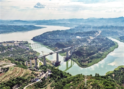 8月18日,由中国铁建大桥局承建的重庆至万州高速铁路(渝万高铁)渠溪河双线特大桥顺利合龙。渝万高铁渠溪河双线特大桥位于重庆市涪陵区珍溪镇,横跨长江支流渠溪河,全长约953米,是全线重难点工程。图为8月18日拍摄的渝万高铁渠溪河双线特大桥施工现场。 新华社发