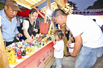 广场两侧的“文明集市”更是热闹非凡。非遗体验区内,竹编、酱姜片制作等技艺吸引市民驻足,山东村手艺人现场演示的泥狗子塑形引得孩子们争相体验。