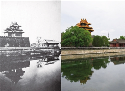 拼版照片:左图为20世纪初拍摄的角楼(故宫博物院供图);右图为2025年10月10日拍摄的角楼(新华社记者金良快摄)。