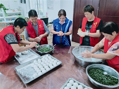 东兴镇何德村志愿者为当天参加活动的老年朋友包汤圆。