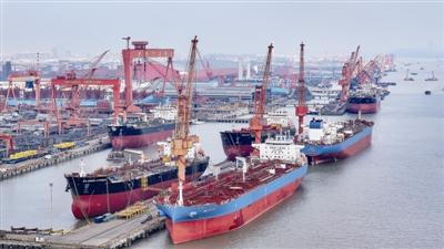 进入四季度,全市各生产企业开足马力赶制订单,全力冲刺全年目标。图为江苏扬子江船业集团舾装码头排起长龙,一批高技术船舶即将试航交付。朱其摄