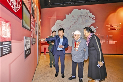 图为丁位西老人(右二)参观我市“东线第一帆”纪念馆。盛义摄