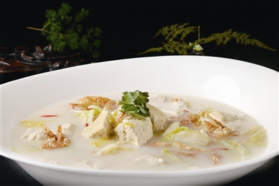 食材:白菜300克、嫩豆腐1块、粉条100克、姜3片、大葱1根、酱油、料酒、盐、白胡椒粉等。