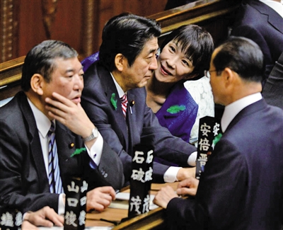 图为2015年4月21日,在日本国会众议院,安倍晋三(左二)与高市早苗(右二)商谈。新华社发