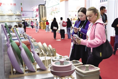 10月23日,第138届广交会第二期开幕,以“品质家居”为主题,集中展示家庭用品、礼品及装饰品、建材及家具3大板块。二期线下展览总面积51.5万平方米,展位2.5万个,参展企业超1万家。图为10月23日,客商在广交会上参观拍摄厨具产品。新华社发