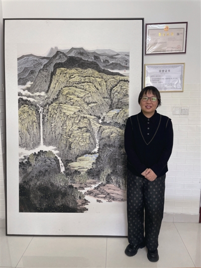 在位于人民路新跃桥附近的陆常红个人工作室,这幅画心高1.8米、宽1.2米的获奖作品格外引人注目。画面上,春雨初歇的山村褪去朦胧,袅袅烟火与青绿山峦相映成趣,自然之美与山村烟火气巧妙融为一体,仿佛将观者带入了一个宁静而美好的世外桃源。陆常红介绍,这幅画通过烟火与自然景色的结合,既体现乡村生活的恬静,又蕴含农忙的生机。在创作技法上,她运用写意水墨描画出高山流水、村落的远近层次,展现出山村的辽阔静谧。