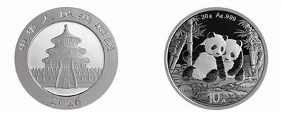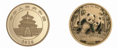 2026版熊猫币正面图案均为北京天坛祈年殿,并刊国名、年号;背面图案首次采用了“情侣熊猫”主题,生动描绘了两只大熊猫在幽静竹林中相互依偎、惬意休憩的灵动场景,一改往年常见的单独熊猫形象,画面温馨和谐,情感表达更为丰富,极具艺术感染力。