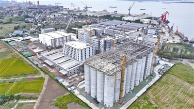 昨日,位于靖江经济技术开发区的中粮面业(靖江)有限公司小麦精加工项目正加紧建设,目前厂房主体工程基本建成,正在进行外墙施工及相关配套设施建设,部分设备已开始进场安装。图为项目建设现场。