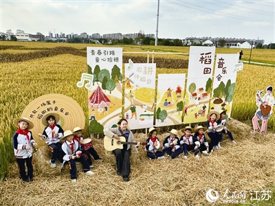 据人民网 近日,无锡光影“十四五”摄影大赛作品展暨胡埭镇富安乡村振兴摄影文化周在无锡滨湖区开幕。在金色翻涌的梯田之中,摄影作品被嵌入自然景观,形成“人在画中行,影随稻浪动”的沉浸式观展体验。 据悉,此次展览以“丰收”为主线,将田野化作流动的摄影棚,百余幅高清摄影作品均由专业摄影师携本地居民共同创作,以多元视角记录下富安村金秋时节的丰饶图景。活动现场,学生们割稻、脱粒、扎稻草人、做粢饭团……了解传统农耕流程,增强对农业生产的认知。 图为学生们演唱丰收之歌。周梦娇摄