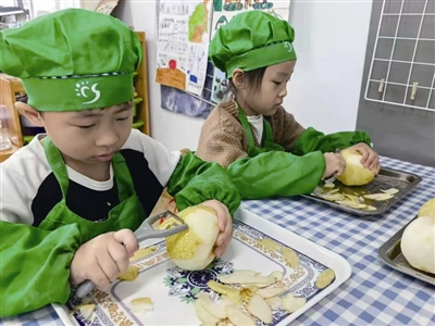 与此同时,大班的哥哥姐姐们则化身“小厨师”,用心熬制了清润可口的雪梨汤,他们期待着将这杯亲手制作的温暖亲手奉给长辈。