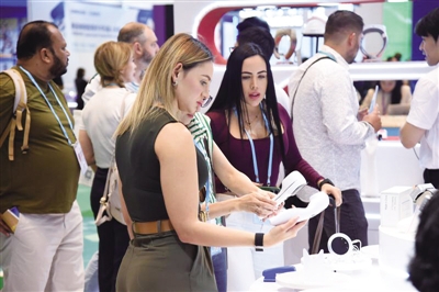 10月31日,以“美好生活”为主题的第138届广交会第三期开幕。本届广交会首次设立“智慧医疗专区”,吸引国内智慧医疗领军企业集中亮相。第138届广交会第三期涵盖玩具及孕婴童、时尚、家用纺织品、文具、健康休闲5个板块,设立21个展区。图为10月31日,客商在广交会智慧医疗专区查看展品。新华社发