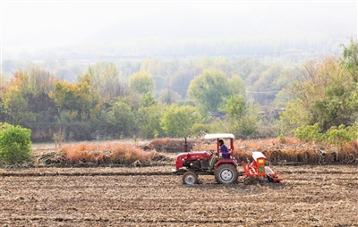 图为11月3日,在河北省石家庄市井陉县威州镇东街村田地,农户驾驶农机播种冬小麦。新华社发