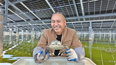 在生祠镇三圩村,一排排柱子撑起了连片的光伏板,如同捕光大网般,源源不断地将太阳能转化为绿色电能。光伏板下方的水域下面则是另一番丰收景象,半斤重的大闸蟹膏满黄肥,养殖户在夜里放下地笼,次日早晨就能收获满笼螃蟹。“今年螃蟹质量还不错,母蟹有四两重,公蟹有半斤重!”养殖户沙增荣高兴地说。