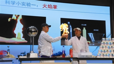 活动现场,两位科普实验师配合默契,将深奥的科学原理“翻译”成一个个直观且有趣的实验,为师生带来了一场生动有趣的科学盛宴。“火焰掌”实验中,科普实验师手掌间舞动的火焰,让学生们瞪大了双眼,该实验是物理知识“施展魔法”,燃烧条件和隔热原理结合,造就了这神奇一幕。“静电飞碗”实验通过静电作用,让原本柔顺的头发竖起,蛋挞壳仿佛也被赋予生命。“烟雾炮”实验通过烟雾机制造的“空气炮弹”,学生们亲眼看到涡环现象,感受空气的无形力量。还有“雷霆出击”“一张纸的威力”“神奇的气压”和“腾云驾雾”等趣味实验,以直观生动的方式揭示科学原理,让学生们在亲身体验中真切感受科学的奇妙与魅力。