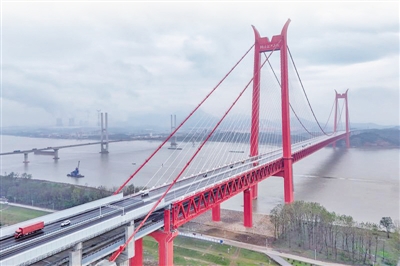 11月6日,由中铁大桥局施工的铜陵长江三桥正式通车。该桥是我国首座双层斜拉—悬索协作体系大桥,路线全长11.9公里,具有高速公路、城际铁路、货运铁路三种过江功能。图为11月6日,车辆行驶在正式通车的铜陵长江三桥上。新华社发