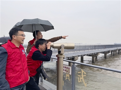 位于“东线第一帆”纪念公园上游50米的靖江长江江豚观景平台于日前建成投用。平台上设有江豚主题雕塑与江豚公益知识宣传展示板,东西两侧各配备一架望远镜,方便市民群众在此观测江豚的踪影。图为昨天下午,江豚保护志愿者在平台上观测长江靖江段江豚。严智勇摄 ??详见今日2版