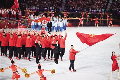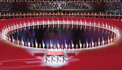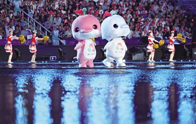 11月9日,第十五届全国运动会开幕式在广东奥林匹克体育中心举行。图一为11月9日,旗手护送中华人民共和国国旗入场;图二为11月9日,江苏省体育代表团在入场仪式上;图三为11月9日,第十五届全国运动会吉祥物“喜洋洋”和“乐融融”在开幕式现场表演。 新华社发