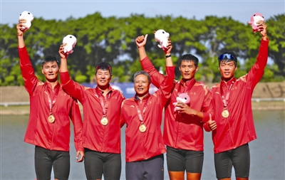 图为江苏队在男子四人双桨项目冠军颁奖仪式上(左一为张自毫)。