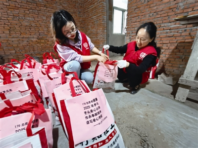 11月8日上午,薛金燕和另外5名志愿者来到陈奶奶家,根据此前线上招募发布的农产品爱心认购名单,将29名爱心人士认购的农产品依次分装打包完毕,一部分农产品由志愿者送货上门,另一部分农产品由爱心人士自行至市179志愿者协会自提。