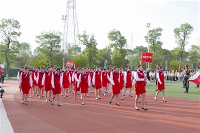 机械工程系的学子们身着工装,手持焊接足球、数控机床模型等技能大赛获奖作品,自信地展示着“科技赋能、技能筑梦”的智育成果;现代服务系方阵中,汽修专业手举模型与工具,航空服务专业身着笔挺红色制服,烹饪专业亮出特色烹饪用具,将未来职业场景与体育精神相连,体现了职业素养与专业技能的结合;自动控制系、信息工程系与基础教学系的同学们挥舞国旗,展示着自制的电子显示屏,科技创意十足;财经商贸系方阵则手执算盘,在清脆的响声中,用专业技艺传递着精益求精的工匠精神。