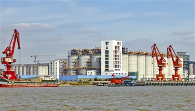 作为国家重大粮食物流体系建设项目,中粮贸易(靖江)有限公司粮油仓储物流基地正加紧建设。目前,该项目陆域筒仓土建工程及设备安装已基本完成,正在开展码头水域升级改造工程及相关配套设施建设。图为项目建设现场。 朱其摄