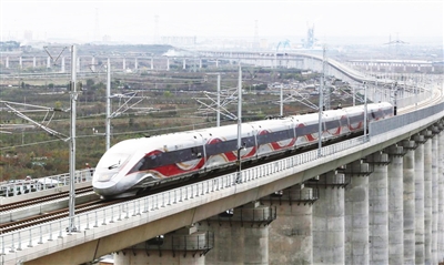 11月17日上午,55302次试验动车组沿着新建西安至延安高速铁路驶向延安站,这标志着西延高铁正式从联调联试阶段全面转入运行试验阶段,全线开通运营进入倒计时。西安至延安高速铁路是陕北革命老区的首条高铁,线路全长299.8公里,设计时速350公里。西延高铁开通后,西安至延安的铁路运行时间将从目前约2.5小时缩短至1小时左右。图为11月17日,一列试验动车组通过西延高铁富平特大桥。??新华社发