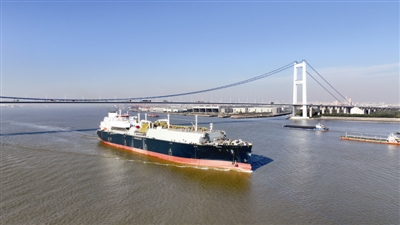 昨天,中国民营船企大型LNG运输船“第一船”——扬子江船业集团首制17.5万立方米LNG运输船开启试航。图为首制船穿过江阴长江公路大桥。何阳摄