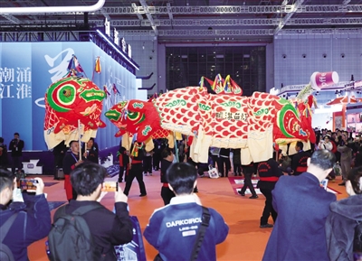 上图为11月20日,观众在江苏展区参观苏超文创产品;右图为11月20日在安徽展区拍摄的瞻淇鱼灯表演。新华社发
