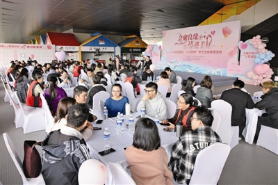 图为穿着红马甲的工会红娘志愿者引导单身青年深入交流。盛义摄